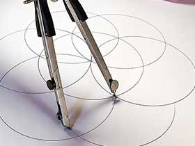 Jeder neue Kreis entsteht aus einem vorhandenen Mittelpunkt. Ein Kreis in der Mitte, sechs Kreise in der ersten Ebene darum herum und zwölf weitere Kreise in der äußeren Ebene.